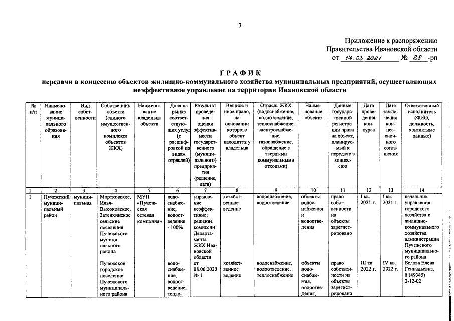 Распоряжение Правительства Ивановской области от 17.03.2021 N 28-рп "Об утверждении графика передачи в концессию объектов жилищно-коммунального хозяйства муниципальных предприятий, осуществляющих неэффективное управление на территории Ивановской области, и о признании утратившим силу распоряжения Правительства Ивановской области от 10.06.2019 N 88-рп "Об утверждении графика передачи в концессию объектов жилищно-коммунального хозяйства муниципальных предприятий, осуществляющих неэффективное управление на территории Ивановской области"