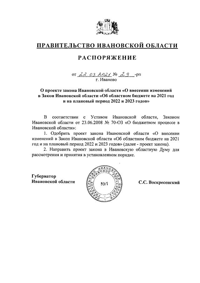 Распоряжение Правительства Ивановской области от 22.03.2021 N 29-рп "О проекте закона Ивановской области "О внесении изменений в Закон Ивановской области "Об областном бюджете на 2021 год и на плановый период 2022 и 2023 годов"