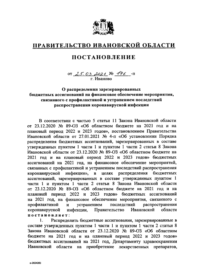 Постановление Правительства Ивановской области от 25.03.2021 N 146-п "О распределении зарезервированных бюджетных ассигнований на финансовое обеспечение мероприятия, связанного с профилактикой и устранением последствий распространения коронавирусной инфекции"