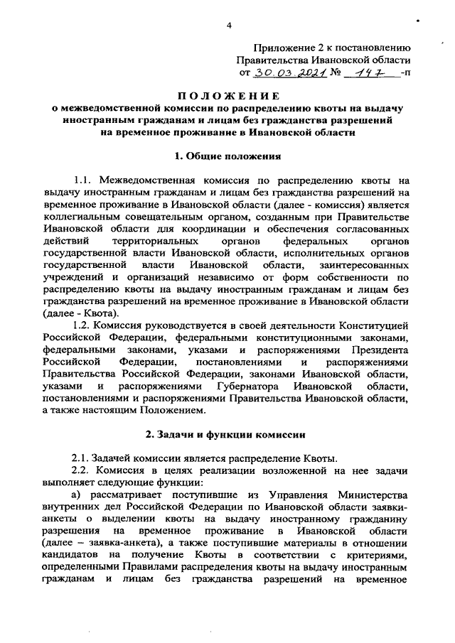 Постановление Правительства Ивановской области от 30.03.2021 N 147-п "О межведомственной комиссии по распределению квоты на выдачу иностранным гражданам и лицам без гражданства разрешений на временное проживание в Ивановской области" (вместе с "Положением о межведомственной комиссии по распределению квоты на выдачу иностранным гражданам и лицам без гражданства разрешений на временное проживание в Ивановской области")