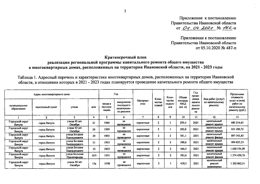 Постановление Правительства Ивановской области от 01.04.2021 N 162-п "О внесении изменения в постановление Правительства Ивановской области от 05.10.2020 N 487-п "Об утверждении краткосрочного плана реализации региональной программы капитального ремонта общего имущества в многоквартирных домах, расположенных на территории Ивановской области, на 2021 - 2023 годы"