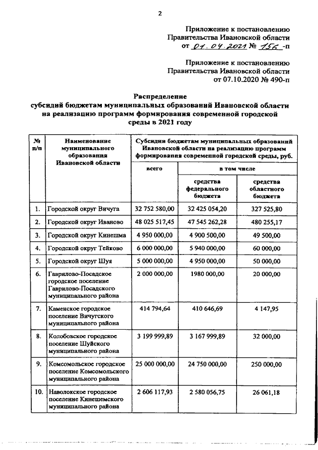 Постановление Правительства Ивановской области от 01.04.2021 N 156-п "О внесении изменения в постановление Правительства Ивановской области от 07.10.2020 N 490-п "О распределении субсидий бюджетам муниципальных образований на реализацию программ формирования современной городской среды в 2021 году"