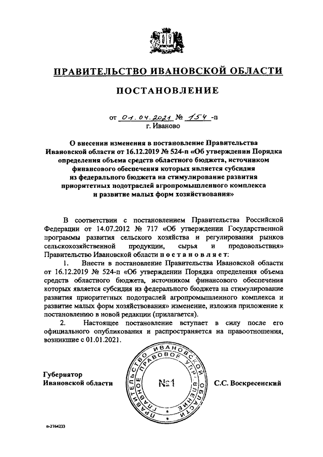 Постановление Правительства Ивановской области от 01.04.2021 N 154-п "О внесении изменения в постановление Правительства Ивановской области от 16.12.2019 N 524-п "Об утверждении Порядка определения объема средств областного бюджета, источником финансового обеспечения которых является субсидия из федерального бюджета на стимулирование развития приоритетных подотраслей агропромышленного комплекса и развитие малых форм хозяйствования"
