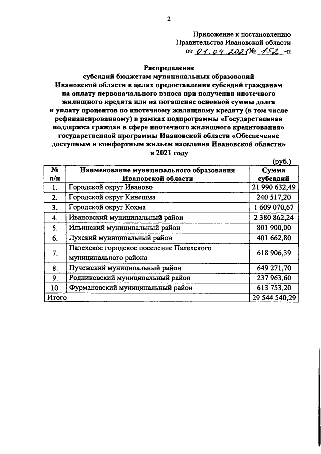 Постановление Правительства Ивановской области от 01.04.2021 N 152-п "О распределении субсидий бюджетам муниципальных образований Ивановской области в целях предоставления субсидий гражданам на оплату первоначального взноса при получении ипотечного жилищного кредита или на погашение основной суммы долга и уплату процентов по ипотечному жилищному кредиту (в том числе рефинансированному) в рамках подпрограммы "Государственная поддержка граждан в сфере ипотечного жилищного кредитования" государственной программы Ивановской области "Обеспечение доступным и комфортным жильем населения Ивановской области" в 2021 году"