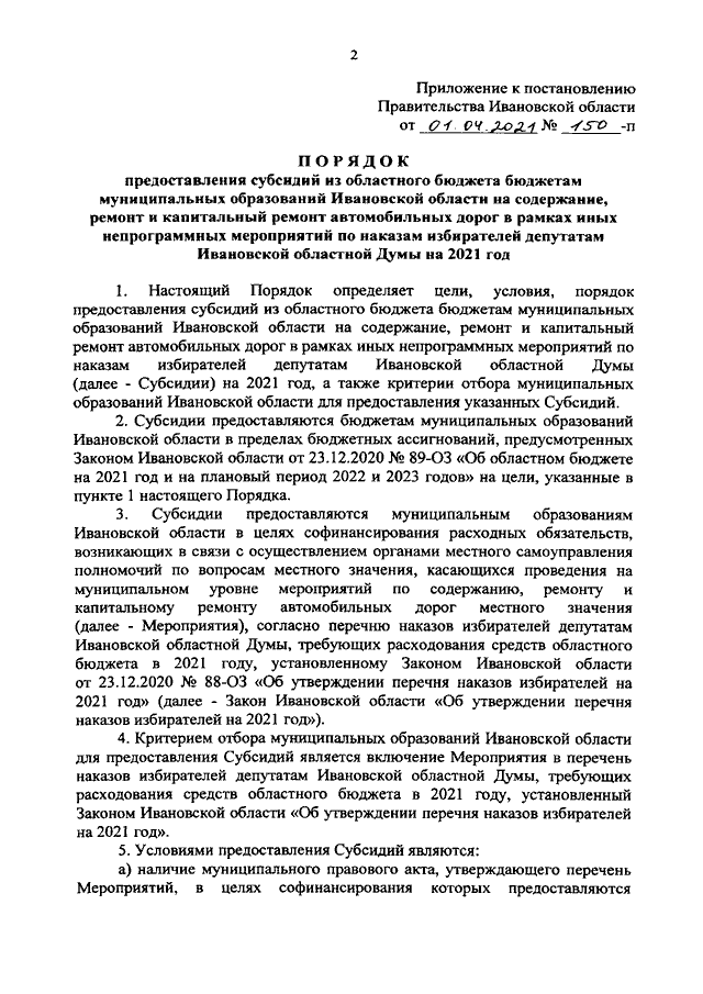 Постановление Правительства Ивановской области от 01.04.2021 N 150-п "Об утверждении Порядка предоставления субсидий из областного бюджета бюджетам муниципальных образований Ивановской области на содержание, ремонт и капитальный ремонт автомобильных дорог в рамках иных непрограммных мероприятий по наказам избирателей депутатам Ивановской областной Думы на 2021 год"
