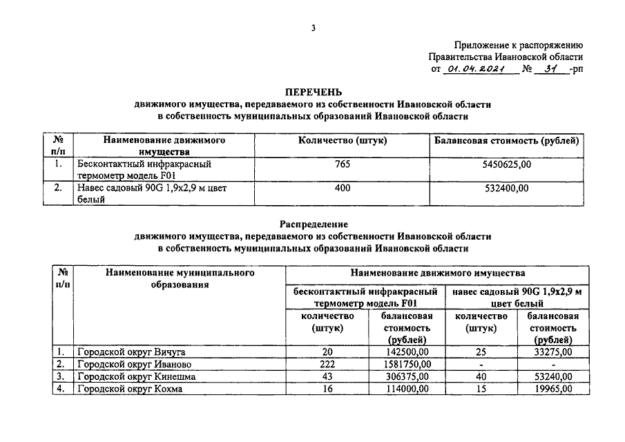 Распоряжение Правительства Ивановской области от 01.04.2021 N 31-рп "О передаче движимого имущества из собственности Ивановской области в собственность муниципальных образований Ивановской области"
