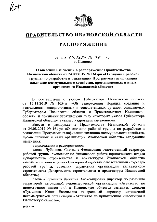Распоряжение Правительства Ивановской области от 08.04.2021 N 35-рп "О внесении изменений в распоряжение Правительства Ивановской области от 24.08.2017 N 161-рп "О создании рабочей группы по разработке и реализации Программы газификации жилищно-коммунального хозяйства, промышленных и иных организаций Ивановской области"