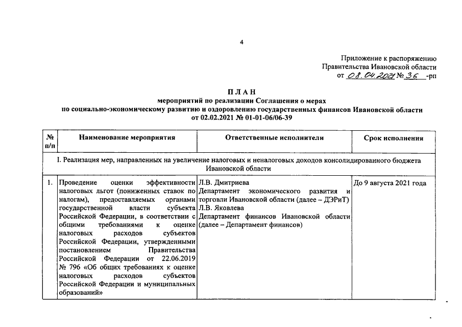 Распоряжение Правительства Ивановской области от 08.04.2021 N 36-рп "О реализации Соглашения о мерах по социально-экономическому развитию и оздоровлению государственных финансов Ивановской области" (вместе с "Планом мероприятий по реализации Соглашения о мерах по социально-экономическому развитию и оздоровлению государственных финансов Ивановской области от 02.02.2021 N 01-01-06/06-39")