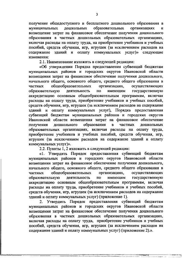 Постановление Правительства Ивановской области от 08.04.2021 N 178-п "О внесении изменений в некоторые постановления Правительства Ивановской области" (вместе с "Порядком предоставления субвенций бюджетам муниципальных районов и городских округов Ивановской области возмещения затрат на финансовое обеспечение получения дошкольного, начального общего, основного общего, среднего общего образования в частных общеобразовательных организациях, осуществляющих образовательную деятельность по имеющим государственную аккредитацию основным общеобразовательным программам, включая расходы на оплату труда, приобретение учебников и учебных пособий, средств обучения, игр, игрушек (за исключением расходов на содержание зданий и оплату коммунальных услуг)", "Порядком предоставления субвенций бюджетам муниципальных районов и городских округов Ивановской области возмещения затрат на финансовое обеспечение получения дошкольного образования в частных дошкольных образовательных организациях, включая расходы на оплату труда, приобретение учебников и учебных пособий, средств обучения, игр, игрушек (за исключением расходов на содержание зданий и оплату коммунальных услуг)", "Порядком предоставления субвенций бюджетам муниципальных районов и городских округов Ивановской области на финансовое обеспечение государственных гарантий реализации прав на получение общедоступного и бесплатного дошкольного, начального общего, основного общего, среднего общего образования в муниципальных общеобразовательных организациях, обеспечение дополнительного образования в муниципальных общеобразовательных организациях, включая расходы на оплату труда, приобретение учебников и учебных пособий, средств обучения, игр, игрушек (за исключением расходов на содержание зданий и оплату коммунальных услуг)", "Порядком предоставления субвенций бюджетам муниципальных районов и городских округов Ивановской области на финансовое обеспечение государственных гарантий реализации прав на получение общедоступного и бесплатного дошкольного образования в муниципальных дошкольных образовательных организациях, включая расходы на оплату труда, приобретение учебников и учебных пособий, средств обучения, игр, игрушек (за исключением расходов на содержание зданий и оплату коммунальных услуг)", "Порядком предоставления субвенций бюджетам муниципальных районов и городских округов Ивановской области на осуществление переданных государственных полномочий по выплате компенсации части родительской платы за присмотр и уход за детьми в образовательных организациях, реализующих образовательную программу дошкольного образования")