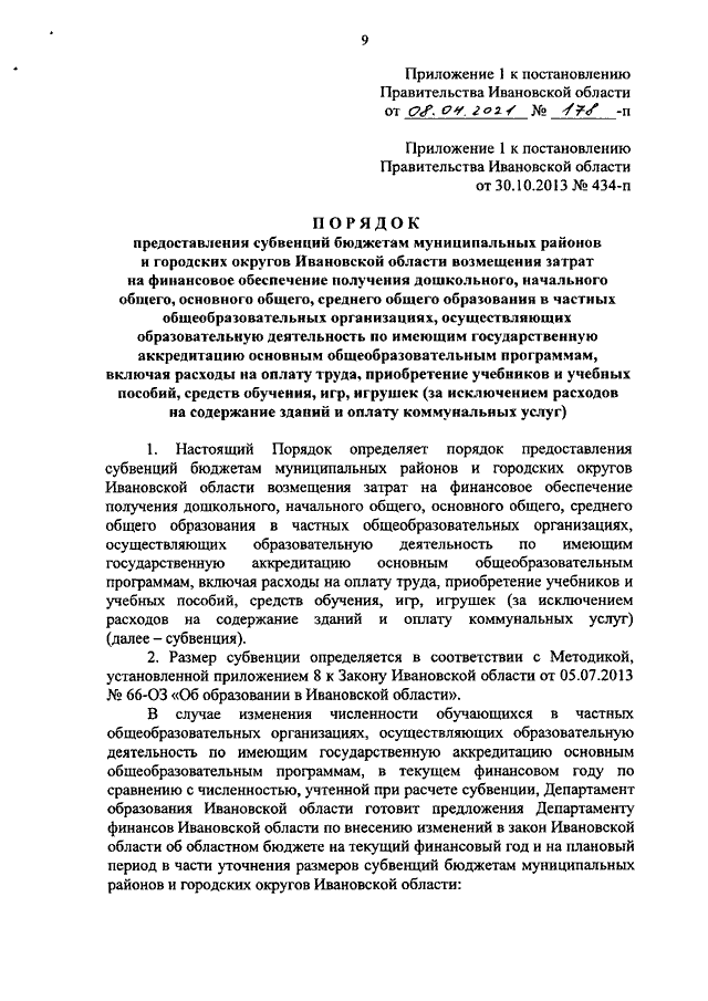 Постановление Правительства Ивановской области от 08.04.2021 N 178-п "О внесении изменений в некоторые постановления Правительства Ивановской области" (вместе с "Порядком предоставления субвенций бюджетам муниципальных районов и городских округов Ивановской области возмещения затрат на финансовое обеспечение получения дошкольного, начального общего, основного общего, среднего общего образования в частных общеобразовательных организациях, осуществляющих образовательную деятельность по имеющим государственную аккредитацию основным общеобразовательным программам, включая расходы на оплату труда, приобретение учебников и учебных пособий, средств обучения, игр, игрушек (за исключением расходов на содержание зданий и оплату коммунальных услуг)", "Порядком предоставления субвенций бюджетам муниципальных районов и городских округов Ивановской области возмещения затрат на финансовое обеспечение получения дошкольного образования в частных дошкольных образовательных организациях, включая расходы на оплату труда, приобретение учебников и учебных пособий, средств обучения, игр, игрушек (за исключением расходов на содержание зданий и оплату коммунальных услуг)", "Порядком предоставления субвенций бюджетам муниципальных районов и городских округов Ивановской области на финансовое обеспечение государственных гарантий реализации прав на получение общедоступного и бесплатного дошкольного, начального общего, основного общего, среднего общего образования в муниципальных общеобразовательных организациях, обеспечение дополнительного образования в муниципальных общеобразовательных организациях, включая расходы на оплату труда, приобретение учебников и учебных пособий, средств обучения, игр, игрушек (за исключением расходов на содержание зданий и оплату коммунальных услуг)", "Порядком предоставления субвенций бюджетам муниципальных районов и городских округов Ивановской области на финансовое обеспечение государственных гарантий реализации прав на получение общедоступного и бесплатного дошкольного образования в муниципальных дошкольных образовательных организациях, включая расходы на оплату труда, приобретение учебников и учебных пособий, средств обучения, игр, игрушек (за исключением расходов на содержание зданий и оплату коммунальных услуг)", "Порядком предоставления субвенций бюджетам муниципальных районов и городских округов Ивановской области на осуществление переданных государственных полномочий по выплате компенсации части родительской платы за присмотр и уход за детьми в образовательных организациях, реализующих образовательную программу дошкольного образования")