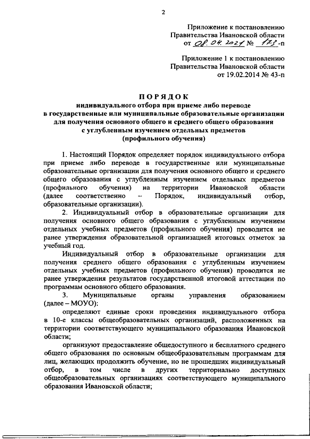 Постановление Правительства Ивановской области от 08.04.2021 N 173-п "О внесении изменений в постановление Правительства Ивановской области от 19.02.2014 N 43-п "О случаях и Порядке индивидуального отбора граждан при приеме либо переводе в государственные или муниципальные образовательные организации для получения основного общего и среднего общего образования с углубленным изучением отдельных предметов (профильного обучения)"