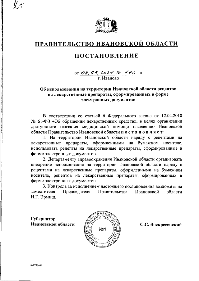 Постановление Правительства Ивановской области от 08.04.2021 N 170-п "Об использовании на территории Ивановской области рецептов на лекарственные препараты, сформированных в форме электронных документов"