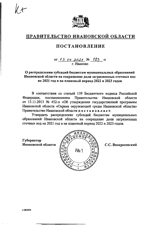 Постановление Правительства Ивановской области от 13.04.2021 N 183-п "О распределении субсидий бюджетам муниципальных образований Ивановской области на сокращение доли загрязненных сточных вод на 2021 год и на плановый период 2022 и 2023 годов"