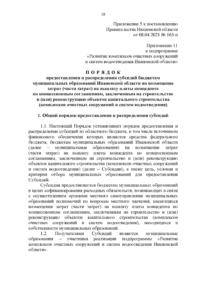 Постановление Правительства Ивановской области от 08.04.2021 N 163-п "О внесении изменений в постановление Правительства Ивановской области от 13.11.2013 N 452-п "Об утверждении государственной программы Ивановской области "Охрана окружающей среды Ивановской области" (вместе с "Порядком предоставления и распределения субсидий бюджетам муниципальных образований Ивановской области на возмещение затрат (части затрат) на выплату платы концедента по концессионным соглашениям, заключенным на строительство и (или) реконструкцию объектов капитального строительства (комплексов очистных сооружений и систем водоотведения)")