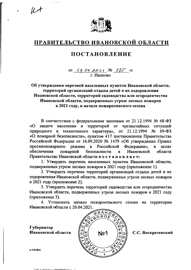 Постановление Правительства Ивановской области от 19.04.2021 N 185-п "Об утверждении перечней населенных пунктов Ивановской области, территорий организаций отдыха детей и их оздоровления Ивановской области, территорий садоводства или огородничества Ивановской области, подверженных угрозе лесных пожаров в 2021 году, и начале пожароопасного сезона"