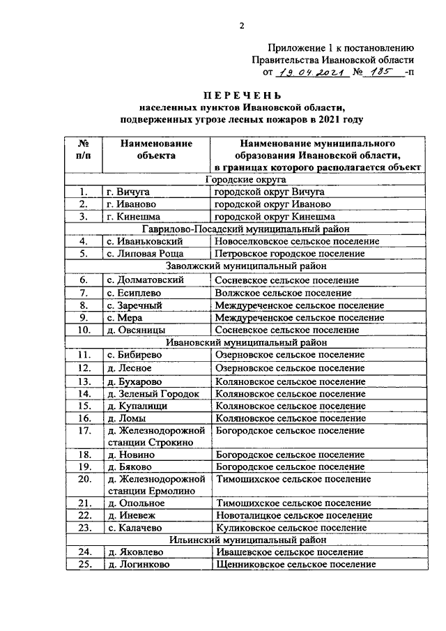 Постановление Правительства Ивановской области от 19.04.2021 N 185-п "Об утверждении перечней населенных пунктов Ивановской области, территорий организаций отдыха детей и их оздоровления Ивановской области, территорий садоводства или огородничества Ивановской области, подверженных угрозе лесных пожаров в 2021 году, и начале пожароопасного сезона"