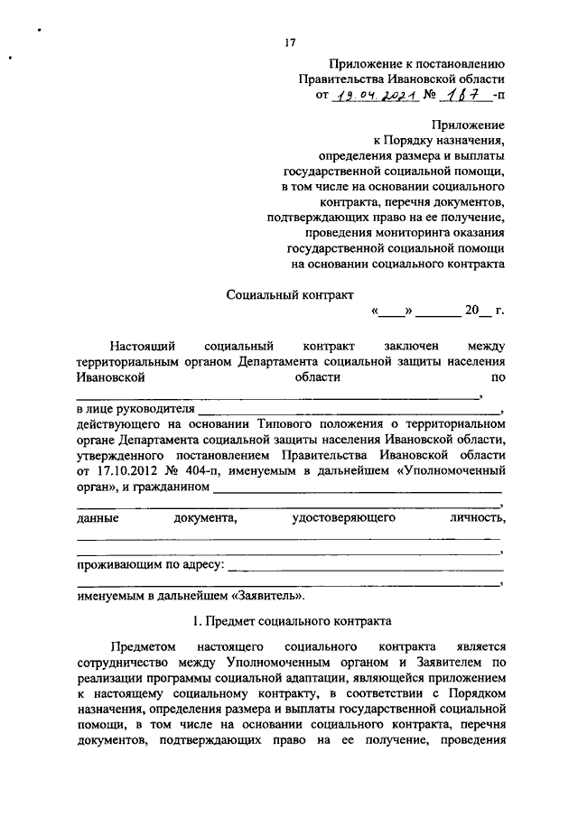 Постановление Правительства Ивановской области от 19.04.2021 N 187-п "О внесении изменений в постановление Правительства Ивановской области от 22.01.2020 N 12-п "Об оказании государственной социальной помощи, в том числе на основании социального контракта" и признании утратившим силу постановления Правительства Ивановской области от 13.08.2020 N 375-п "Об утверждении Порядка предоставления субсидий работодателям на возмещение затрат на проведение стажировки граждан, заключивших социальный контракт на реализацию мероприятия по прохождению профессионального обучения или получению дополнительного профессионального образования, в том числе в форме стажировки, Порядка предоставления субсидий организациям, осуществляющим образовательную деятельность, на возмещение затрат в связи с прохождением гражданами, заключившими социальный контракт, профессионального обучения или получением дополнительного профессионального образования, в том числе в форме стажировки"