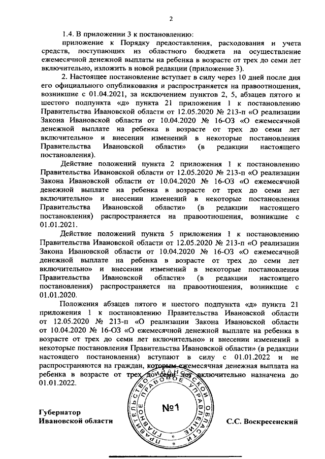 Постановление Правительства Ивановской области от 19.04.2021 N 188-п "О внесении изменений в постановление Правительства Ивановской области от 12.05.2020 N 213-п "О реализации Закона Ивановской области от 10.04.2020 N 16-ОЗ "О ежемесячной денежной выплате на ребенка в возрасте от трех до семи лет включительно" и внесении изменений в некоторые постановления Правительства Ивановской области" (вместе с "Порядком и условиями предоставления ежемесячной денежной выплаты на ребенка в возрасте от трех до семи лет включительно", "Перечнем документов (сведений), необходимых для назначения ежемесячной денежной выплаты на ребенка в возрасте от трех до семи лет включительно")