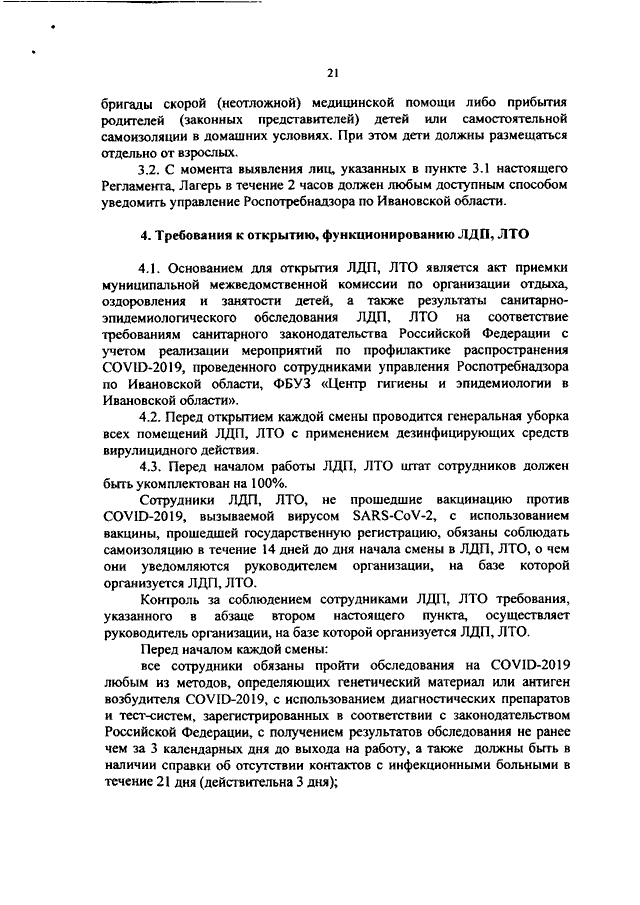 Постановление Правительства Ивановской области от 20.04.2021 N 190-п "О внесении изменений в постановление Правительства Ивановской области от 08.05.2020 N 209-п "Об утверждении регламентов по проведению профилактических мероприятий и дезинфекции в целях недопущения распространения новой коронавирусной инфекции (COVID-2019) на территории Ивановской области" (вместе с "Регламентом порядка работы организаций отдыха детей и их оздоровления, состоящих в Реестре организаций отдыха детей и их оздоровления на территории Ивановской области, в целях недопущения распространения новой коронавирусной инфекции (COVID-2019) на территории Ивановской области")
