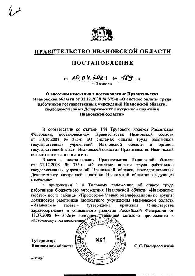 Постановление Правительства Ивановской области от 20.04.2021 N 189-п "О внесении изменения в постановление Правительства Ивановской области от 31.12.2008 N 375-п "О системе оплаты труда работников государственных учреждений Ивановской области, подведомственных Департаменту внутренней политики Ивановской области"