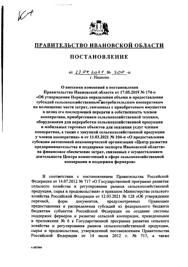 Постановление Правительства Ивановской области от 23.04.2021 N 200-п "О внесении изменений в постановления Правительства Ивановской области от 17.05.2019 N 174-п "Об утверждении Порядка определения объема и предоставления субсидий сельскохозяйственным потребительским кооперативам на возмещение части затрат, связанных с приобретением имущества в целях его последующей передачи в собственность членов кооператива, приобретением сельскохозяйственной техники, оборудования для переработки сельскохозяйственной продукции и мобильных торговых объектов для оказания услуг членам кооператива, а также с закупкой сельскохозяйственной продукции у членов кооператива" и от 11.03.2021 N 104-п "О предоставлении субсидии автономной некоммерческой организации "Центр развития предпринимательства и поддержки экспорта Ивановской области" на финансовое обеспечение затрат, связанных с осуществлением деятельности Центра компетенций в сфере сельскохозяйственной кооперации и поддержки фермеров"