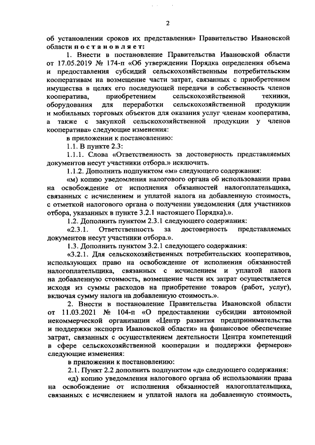 Постановление Правительства Ивановской области от 23.04.2021 N 200-п "О внесении изменений в постановления Правительства Ивановской области от 17.05.2019 N 174-п "Об утверждении Порядка определения объема и предоставления субсидий сельскохозяйственным потребительским кооперативам на возмещение части затрат, связанных с приобретением имущества в целях его последующей передачи в собственность членов кооператива, приобретением сельскохозяйственной техники, оборудования для переработки сельскохозяйственной продукции и мобильных торговых объектов для оказания услуг членам кооператива, а также с закупкой сельскохозяйственной продукции у членов кооператива" и от 11.03.2021 N 104-п "О предоставлении субсидии автономной некоммерческой организации "Центр развития предпринимательства и поддержки экспорта Ивановской области" на финансовое обеспечение затрат, связанных с осуществлением деятельности Центра компетенций в сфере сельскохозяйственной кооперации и поддержки фермеров"