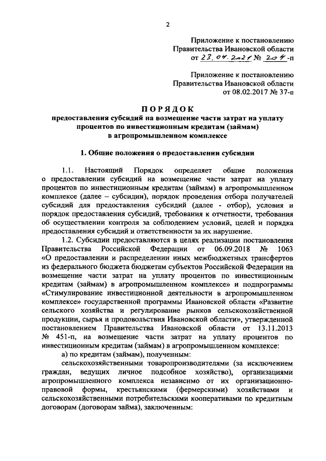 Постановление Правительства Ивановской области от 23.04.2021 N 204-п "О внесении изменения в постановление Правительства Ивановской области от 08.02.2017 N 37-п "Об утверждении Порядка предоставления субсидий на возмещение части затрат на уплату процентов по инвестиционным кредитам (займам) в агропромышленном комплексе"