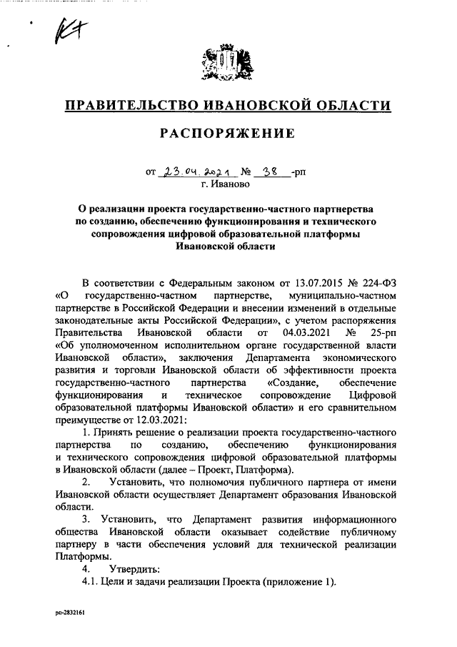 Распоряжение Правительства Ивановской области от 23.04.2021 N 38-рп "О реализации проекта государственно-частного партнерства по созданию, обеспечению функционирования и технического сопровождения цифровой образовательной платформы Ивановской области" (вместе с "Существенными условиями соглашения о государственно-частном партнерстве по созданию, обеспечению функционирования и технического сопровождения цифровой образовательной платформы в Ивановской области")