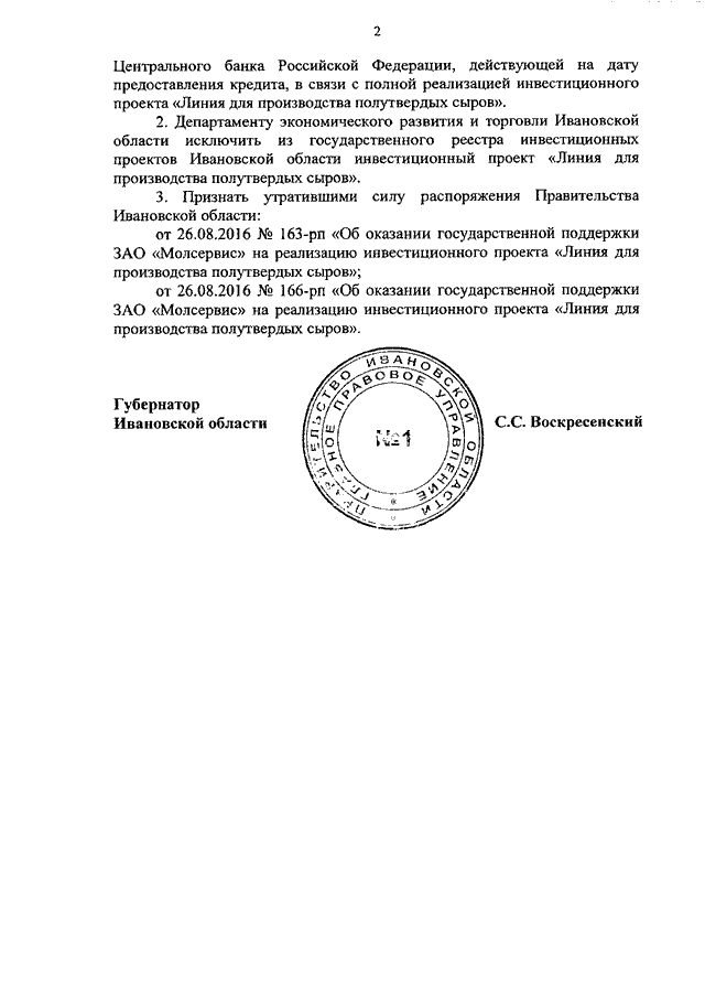 Распоряжение Правительства Ивановской области от 23.04.2021 N 39-рп "Об окончании оказания государственной поддержки ЗАО "Молсервис" на реализацию инвестиционного проекта "Линия для производства полутвердых сыров" и об исключении из государственного реестра инвестиционных проектов указанного инвестиционного проекта Ивановской области"