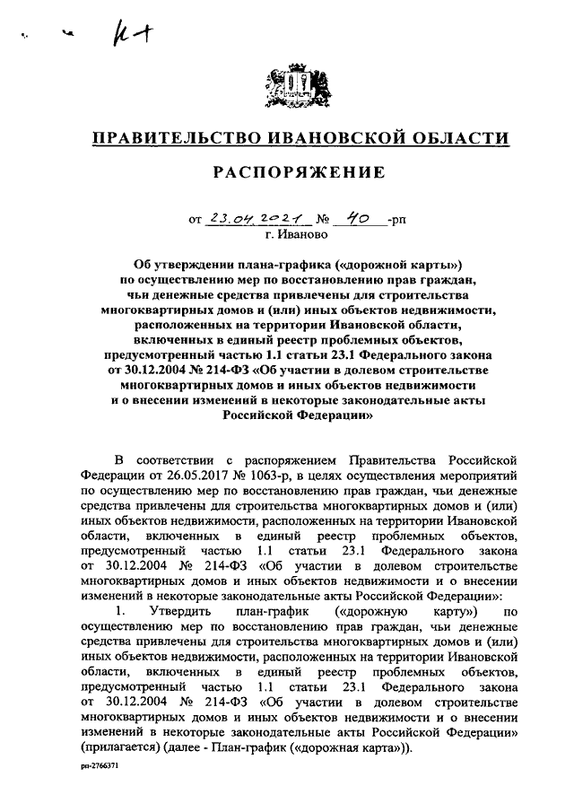 Распоряжение Правительства Ивановской области от 23.04.2021 N 40-рп "Об утверждении плана-графика ("дорожной карты") по осуществлению мер по восстановлению прав граждан, чьи денежные средства привлечены для строительства многоквартирных домов и (или) иных объектов недвижимости, расположенных на территории Ивановской области, включенных в единый реестр проблемных объектов, предусмотренный частью 1.1 статьи 23.1 Федерального закона от 30.12.2004 N 214-ФЗ "Об участии в долевом строительстве многоквартирных домов и иных объектов недвижимости и о внесении изменений в некоторые законодательные акты Российской Федерации"