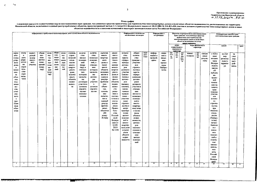 Распоряжение Правительства Ивановской области от 23.04.2021 N 40-рп "Об утверждении плана-графика ("дорожной карты") по осуществлению мер по восстановлению прав граждан, чьи денежные средства привлечены для строительства многоквартирных домов и (или) иных объектов недвижимости, расположенных на территории Ивановской области, включенных в единый реестр проблемных объектов, предусмотренный частью 1.1 статьи 23.1 Федерального закона от 30.12.2004 N 214-ФЗ "Об участии в долевом строительстве многоквартирных домов и иных объектов недвижимости и о внесении изменений в некоторые законодательные акты Российской Федерации"