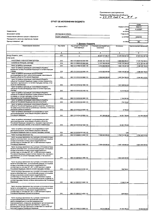 Распоряжение Правительства Ивановской области от 23.04.2021 N 41-рп "Об утверждении отчета об исполнении областного бюджета за I квартал 2021 года"