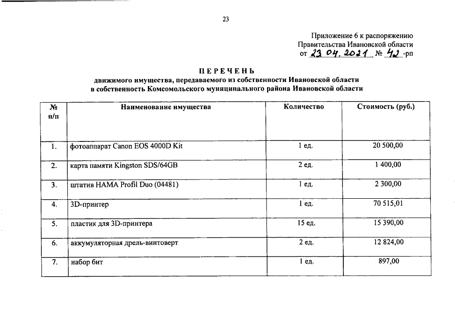 Распоряжение Правительства Ивановской области от 23.04.2021 N 42-рп "О передаче движимого имущества из собственности Ивановской области в собственность муниципальных образований Ивановской области"