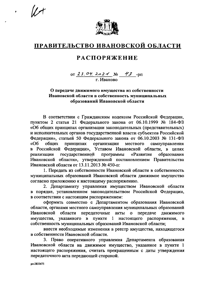 Распоряжение Правительства Ивановской области от 23.04.2021 N 43-рп "О передаче движимого имущества из собственности Ивановской области в собственность муниципальных образований Ивановской области"