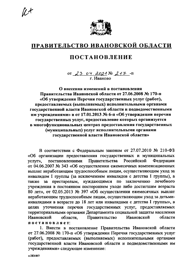 Постановление Правительства Ивановской области от 23.04.2021 N 217-п "О внесении изменений в постановления Правительства Ивановской области от 27.06.2008 N 170-п "Об утверждении Перечня государственных услуг (работ), предоставляемых (выполняемых) исполнительными органами государственной власти Ивановской области и подведомственными им учреждениями" и от 17.01.2013 N 6-п "Об утверждении перечня государственных услуг, предоставление которых организуется в многофункциональных центрах предоставления государственных (муниципальных) услуг исполнительными органами государственной власти Ивановской области"