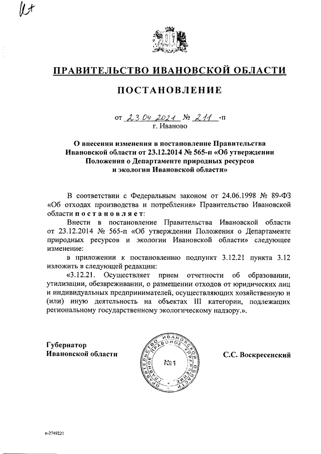 Постановление Правительства Ивановской области от 23.04.2021 N 211-п "О внесении изменения в постановление Правительства Ивановской области от 23.12.2014 N 565-п "Об утверждении Положения о Департаменте природных ресурсов и экологии Ивановской области"
