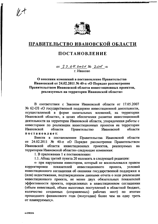 Постановление Правительства Ивановской области от 23.04.2021 N 206-п "О внесении изменений в постановление Правительства Ивановской от 24.02.2011 N 40-п "О Порядке рассмотрения Правительством Ивановской области инвестиционных проектов, реализуемых на территории Ивановской области"
