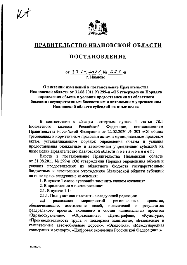 Постановление Правительства Ивановской области от 23.04.2021 N 203-п "О внесении изменений в постановление Правительства Ивановской области от 31.08.2011 N 299-п "Об утверждении Порядка определения объема и условия предоставления из областного бюджета государственным бюджетным и автономным учреждениям Ивановской области субсидий на иные цели"