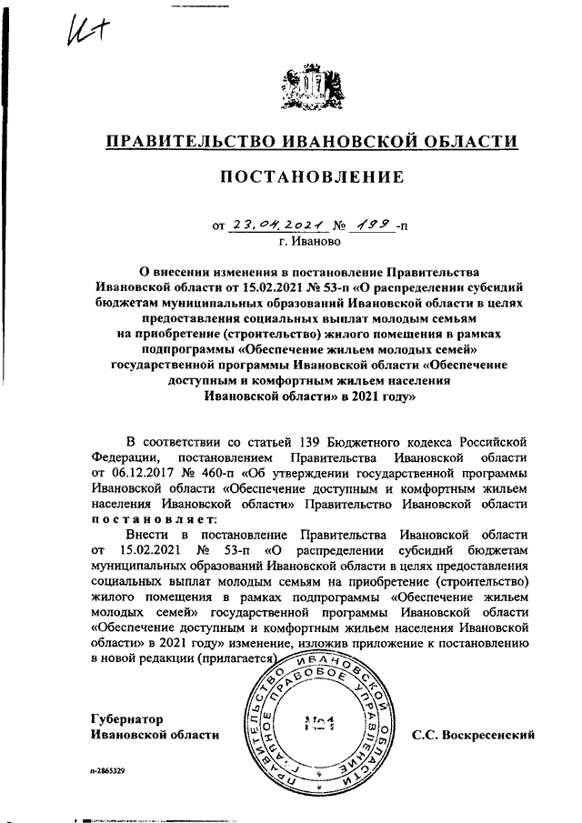 Постановление Правительства Ивановской области от 23.04.2021 N 199-п "О внесении изменения в постановление Правительства Ивановской области от 15.02.2021 N 53-п "О распределении субсидий бюджетам муниципальных образований Ивановской области в целях предоставления социальных выплат молодым семьям на приобретение (строительство) жилого помещения в рамках подпрограммы "Обеспечение жильем молодых семей" государственной программы Ивановской области "Обеспечение доступным и комфортным жильем населения Ивановской области" в 2021 году"