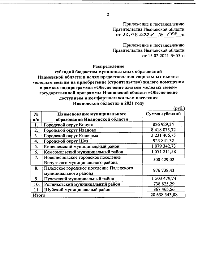 Постановление Правительства Ивановской области от 23.04.2021 N 199-п "О внесении изменения в постановление Правительства Ивановской области от 15.02.2021 N 53-п "О распределении субсидий бюджетам муниципальных образований Ивановской области в целях предоставления социальных выплат молодым семьям на приобретение (строительство) жилого помещения в рамках подпрограммы "Обеспечение жильем молодых семей" государственной программы Ивановской области "Обеспечение доступным и комфортным жильем населения Ивановской области" в 2021 году"