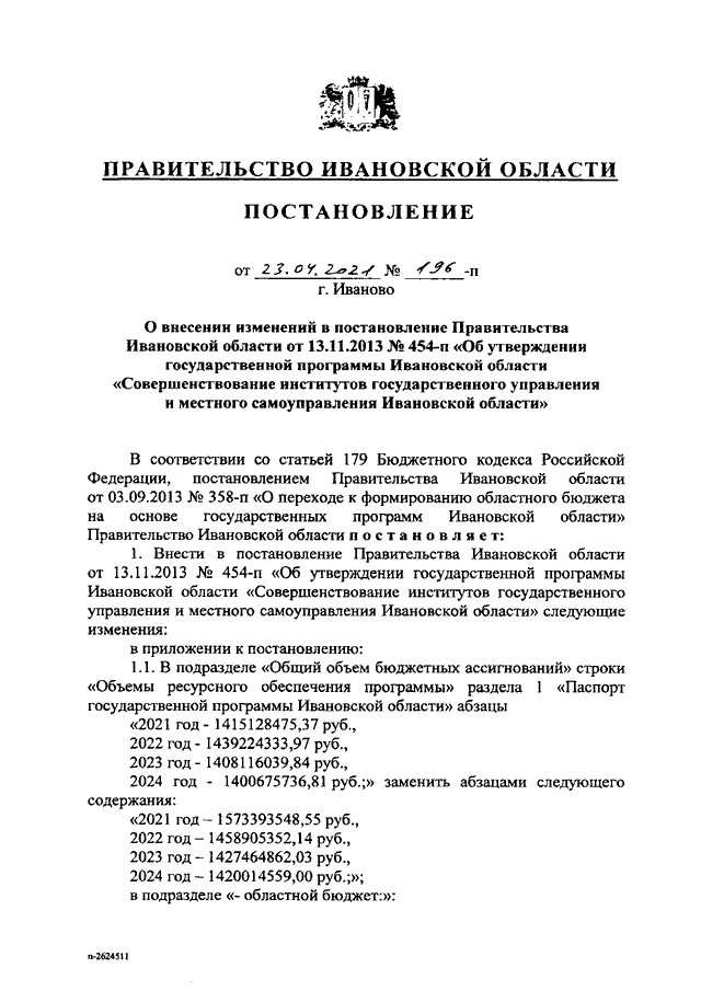 Постановление Правительства Ивановской области от 23.04.2021 N 196-п "О внесении изменений в постановление Правительства Ивановской области от 13.11.2013 N 454-п "Об утверждении государственной программы Ивановской области "Совершенствование институтов государственного управления и местного самоуправления Ивановской области"