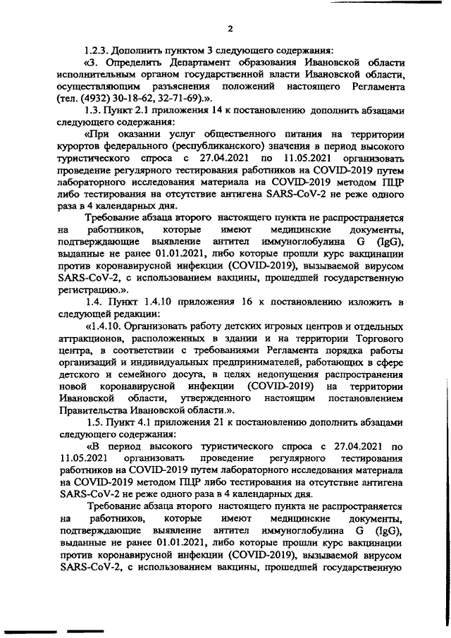 Постановление Правительства Ивановской области от 27.04.2021 N 219-п "О внесении изменений в постановление Правительства Ивановской области от 08.05.2020 N 209-п "Об утверждении регламентов по проведению профилактических мероприятий и дезинфекции в целях недопущения распространения новой коронавирусной инфекции (COVID-2019) на территории Ивановской области"