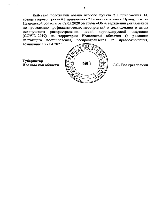Постановление Правительства Ивановской области от 27.04.2021 N 219-п "О внесении изменений в постановление Правительства Ивановской области от 08.05.2020 N 209-п "Об утверждении регламентов по проведению профилактических мероприятий и дезинфекции в целях недопущения распространения новой коронавирусной инфекции (COVID-2019) на территории Ивановской области"