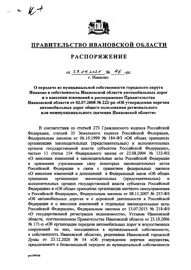 Распоряжение Правительства Ивановской области от 29.04.2021 N 46-рп "О передаче из муниципальной собственности городского округа Иваново в собственность Ивановской области автомобильных дорог и о внесении изменений в распоряжение Правительства Ивановской области от 02.07.2008 N 222-рп "Об утверждении перечня автомобильных дорог общего пользования регионального или межмуниципального значения Ивановской области" (вместе с "Перечнем имущества, передаваемого из муниципальной собственности городского округа Иваново в собственность Ивановской области")