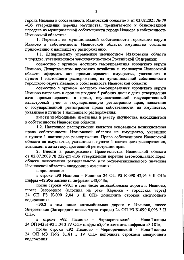 Распоряжение Правительства Ивановской области от 29.04.2021 N 46-рп "О передаче из муниципальной собственности городского округа Иваново в собственность Ивановской области автомобильных дорог и о внесении изменений в распоряжение Правительства Ивановской области от 02.07.2008 N 222-рп "Об утверждении перечня автомобильных дорог общего пользования регионального или межмуниципального значения Ивановской области" (вместе с "Перечнем имущества, передаваемого из муниципальной собственности городского округа Иваново в собственность Ивановской области")