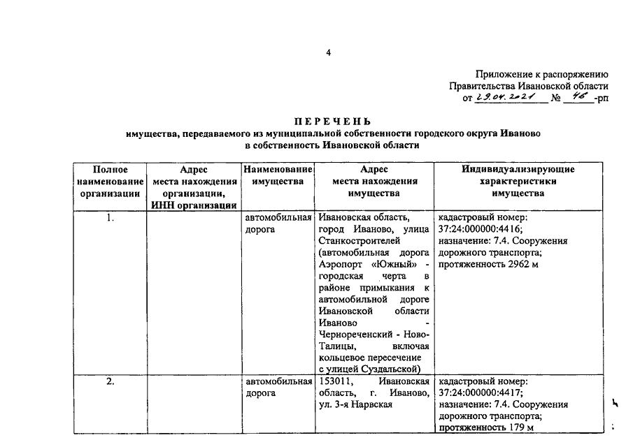 Распоряжение Правительства Ивановской области от 29.04.2021 N 46-рп "О передаче из муниципальной собственности городского округа Иваново в собственность Ивановской области автомобильных дорог и о внесении изменений в распоряжение Правительства Ивановской области от 02.07.2008 N 222-рп "Об утверждении перечня автомобильных дорог общего пользования регионального или межмуниципального значения Ивановской области" (вместе с "Перечнем имущества, передаваемого из муниципальной собственности городского округа Иваново в собственность Ивановской области")