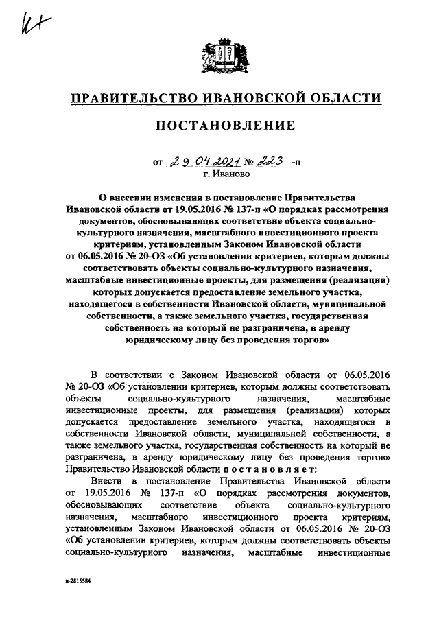 Постановление Правительства Ивановской области от 29.04.2021 N 223-п "О внесении изменения в постановление Правительства Ивановской области от 19.05.2016 N 137-п "О порядках рассмотрения документов, обосновывающих соответствие объекта социально-культурного назначения, масштабного инвестиционного проекта критериям, установленным Законом Ивановской области от 06.05.2016 N 20-ОЗ "Об установлении критериев, которым должны соответствовать объекты социально-культурного назначения, масштабные инвестиционные проекты, для размещения (реализации) которых допускается предоставление земельного участка, находящегося в собственности Ивановской области, муниципальной собственности, а также земельного участка, государственная собственность на который не разграничена, в аренду юридическому лицу без проведения торгов"