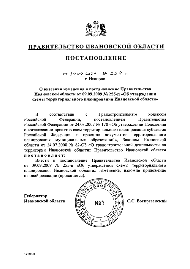 Постановление Правительства Ивановской области от 30.04.2021 N 224-п "О внесении изменения в постановление Правительства Ивановской области от 09.09.2009 N 255-п "Об утверждении схемы территориального планирования Ивановской области"