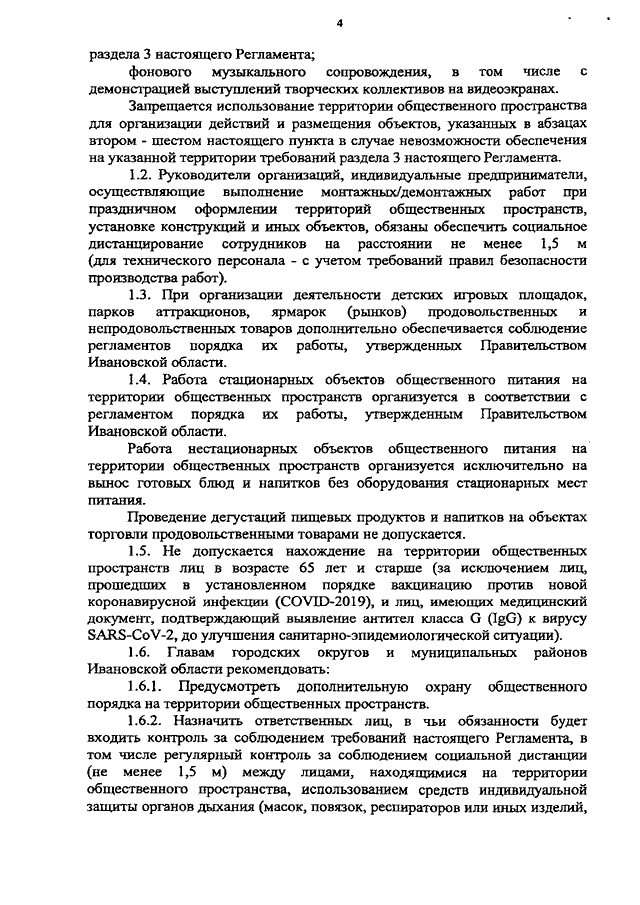 Постановление Правительства Ивановской области от 05.05.2021 N 225-п "О внесении изменений в постановление Правительства Ивановской области от 08.05.2020 N 209-п "Об утверждении регламентов по проведению профилактических мероприятий и дезинфекции в целях недопущения распространения новой коронавирусной инфекции (COVID-2019) на территории Ивановской области" (вместе с "Регламентом порядка организации мероприятий, в том числе в период государственных и религиозных праздников, на территории общественных пространств, парков культуры и отдыха в целях недопущения распространения новой коронавирусной инфекции (COVID-2019) на территории Ивановской области")