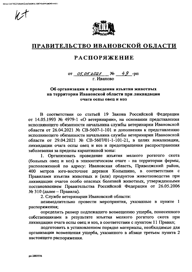 Распоряжение Правительства Ивановской области от 05.05.2021 N 49-рп "Об организации и проведении изъятия животных на территории Ивановской области при ликвидации очага оспы овец и коз"